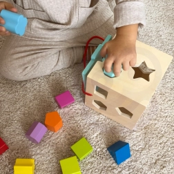 Acest cub ajută copiii să-și dezvolte abilitățile motorii fine prin sortarea formelor și plasarea cuburilor în locurile corecte.