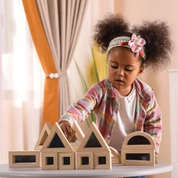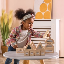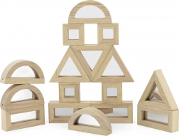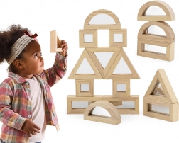Stimulați imaginația celor mici cu cuburi din lemn de calitate cu suprafețe oglindă. Setul include 16 piese în patru forme – dreptunghi, pătrat, triunghi echilateral și semicerc – care se îmbină și se construiesc excelent. Efectul de oglindă sprijină în mod natural conștientizarea de sine și percepția senzorială în timpul jocului.