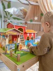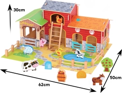 Construiți-vă propria gospodărie acasă! Mega ferma din lemn WOOPIE GREEN îi poartă pe copii în lumea naturii, unde învață să aibă grijă de animale și să descopere viața de zi cu zi la țară. Clădirile realiste (grajd, hambar și coteț), iazul și figurinele detaliate susțin povestirea creativă și jocul de rol.