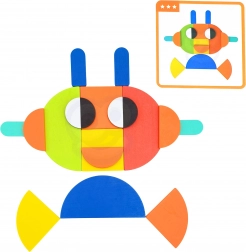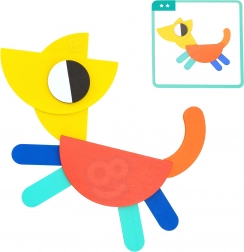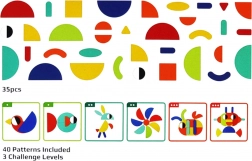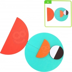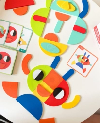 Acest puzzle ingenios combină forme din lemn colorate și carduri față-verso cu modele, prin care copiii își antrenează recunoașterea formelor și a culorilor, imaginația spațială și precizia mișcărilor. Pot asambla după carduri sau pot crea propriile imagini – imaginației nu i se pun limite.