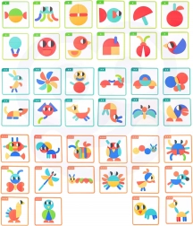 Copiii asamblează forme colorate după cardurile față-verso sau creează propriile imagini. Exersează percepția formelor și a culorilor, concentrarea și precizia mișcărilor – o învățare ludică, care îi încântă.