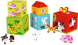 Descoperă cuburile pliabile amuzante și educative cu tematică de fermă de la WOOPIE GREEN. Cutii ilustrate, colorate, cu ferestruici și figurine din lemn cu animale susțin motricitatea fină, învățarea numerelor și recunoașterea animalelor, inclusiv denumirile în limba engleză. Execuție sigură din materiale de calitate și posibilitatea de construcție, inserare și depozitare a mărunțișurilor fac din acest set o jucărie ideală de la 12 luni.