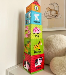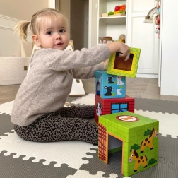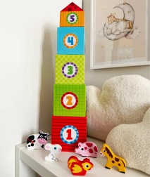 Blocurile numerotate cu ilustrații clare îl învață pe copil să distingă mărimile, să numere și îl familiarizează cu denumirile în engleză ale animalelor – natural, în timpul jocului.