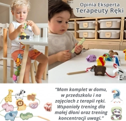 Însăilarea șnurului prin orificiile pieselor antrenează precizia degetelor, prinderea și coordonarea mână–ochi, ideal pentru copii de la 2 ani.