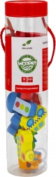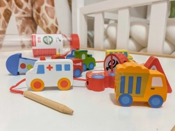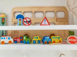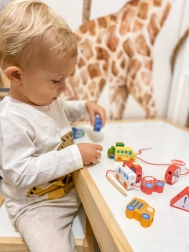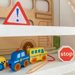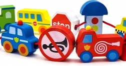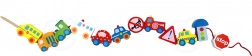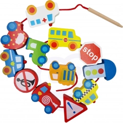 Acest set creativ aduce copiilor de la 2 ani bucuria de a înșira și a combina. Datorită culorilor vii și formelor variate ale vehiculelor, mânuțele deprind precizia și răbdarea, în timp ce copiii asimilează într-un mod ludic elemente de educație rutieră. Lemnul natural și marginile netede oferă o atingere plăcută și sigură.
