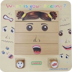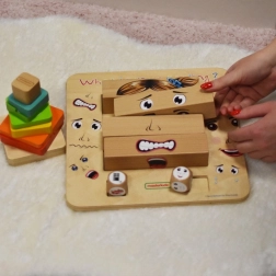 Patru blocuri din lemn le permit copiilor să compună până la 64 de mimici diferite, care ilustrează clar bucuria, tristețea, frica sau furia și îi învață cum expresia feței schimbă sensul emoțiilor.