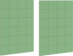 Două panouri verzi cu o rețea de găuri deasă, ideale pentru pixel‑art și mozaicuri din pini – dezvoltă creativitatea și motricitatea fină.