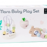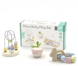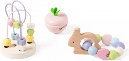 Setul pastel de jucării motivaționale pentru bebeluși de la Classic World este conceput pentru a aduce bucurie și a stimula simțurile copilului încă din primele zile. Acest set din lemn include mai multe piese frumoase care ajută copiii să-și dezvolte motricitatea și concentrarea. Iepurașul fericit este o zornăitoare cu mărgele, care impresionează prin culorile sale și sunetele melodioase. Scuturarea acestei jucării stimulează curiozitatea copilului și susține dezvoltarea abilităților auditive. Labirintul cu mărgele este o altă componentă a setului, unde copiii pot roti și deplasa mărgelele, dezvoltându-și astfel concentrația și abilitățile motorii. Jucăriile din acest set au o textură plăcută și culori pastel, ceea ce este agreabil atât pentru copii, cât și pentru părinți.