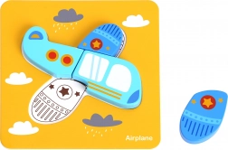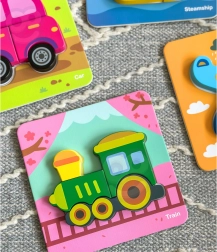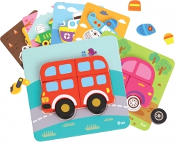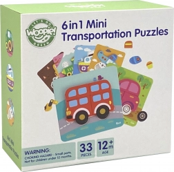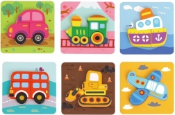 Puzzle din lemn Woopie vehicule este un set cu 33 de elemente care include 6 carduri colorate și rezistente. Copiii trebuie să potrivească elementele mari din lemn pentru a finaliza puzzle-ul colorat.