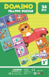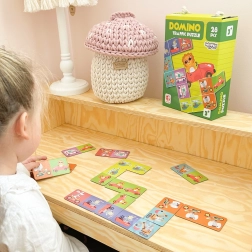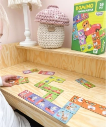 Produsul conține 28 de piese de cărți domino cu ilustrații de animale care trebuie potrivite corect.
