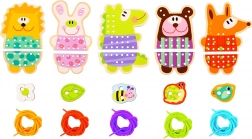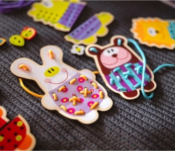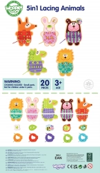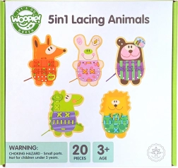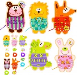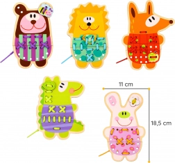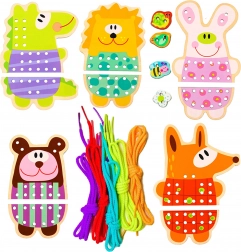 - 5 animăluțe din lemn cu șireturi, 5 elemente pentru „coasere”, 5 șnururi colorate pentru înșirare
