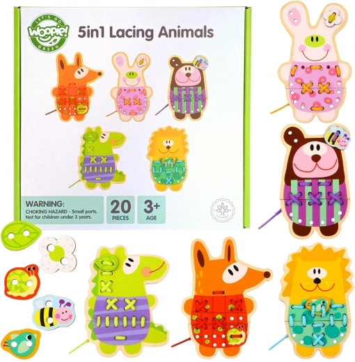 Intrați în lumea distracției creative cu animăluțele din lemn pentru șireturi 5 în 1 de la marca Woopie Green. Acest set educativ este ideal pentru mâini mici și fantezie mare. Confecționat din lemn de calitate și vopsit cu culori netoxice, asigură siguranța și dezvoltarea sănătoasă a copilului.