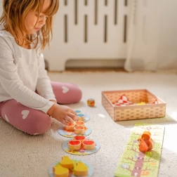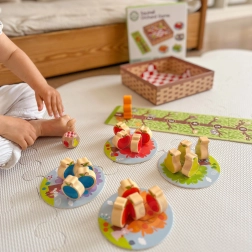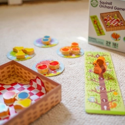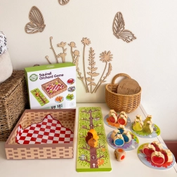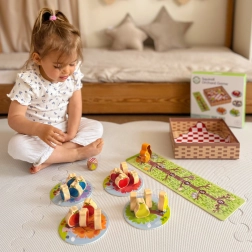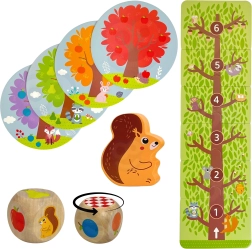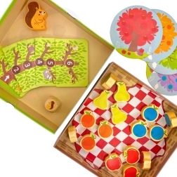 Jocul de familie VEVERIȚA ÎN LIVADĂ de la WOOPIE GREEN este prima alegere ideală de joc de societate pentru cei mici. Copiii aruncă pe rând cu zarul, adună fructe colorate din lemn din copac și le pun în coș. Când iese veverița, unul dintre fructele adunate se întoarce înapoi – tensiunea și bucuria victoriei sunt garantate.
