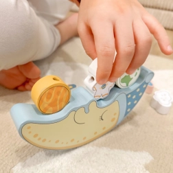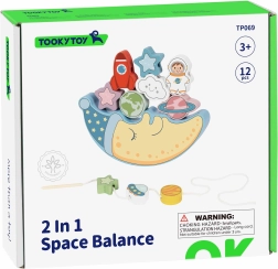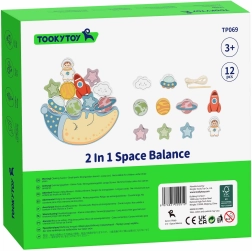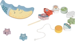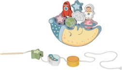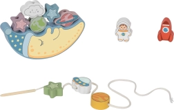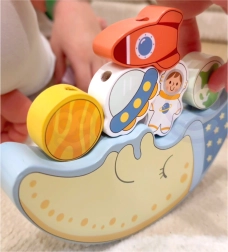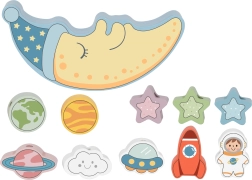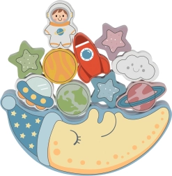 Prima parte a setului este o provocare de echilibrare: copiii încearcă să așeze 10 blocuri colorate – o rachetă, un astronaut, stele, OZN, planete și un nor zâmbitor – pe fața adormită a lunii, încercând să mențină stabilitatea construcției. Este o oportunitate excelentă pentru a exersa precizia și răbdarea.