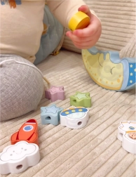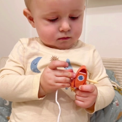 A doua parte oferă un joc creativ de înșiruire: blocurile pot fi înșiruite cu ajutorul acului din lemn și al șnurului, ajutând astfel la dezvoltarea abilităților motorii fine și a coordonării mână-ochi.