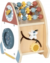 Prin activități diferite de joc, cum ar fi un mic labirint sau ceasuri reglabile, jucăria sprijină gândirea creativă și coordonarea.