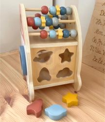 Jucăria ajută la dezvoltarea motoricii fine datorită elementelor interactive, precum mărgelele și sortarea formelor.