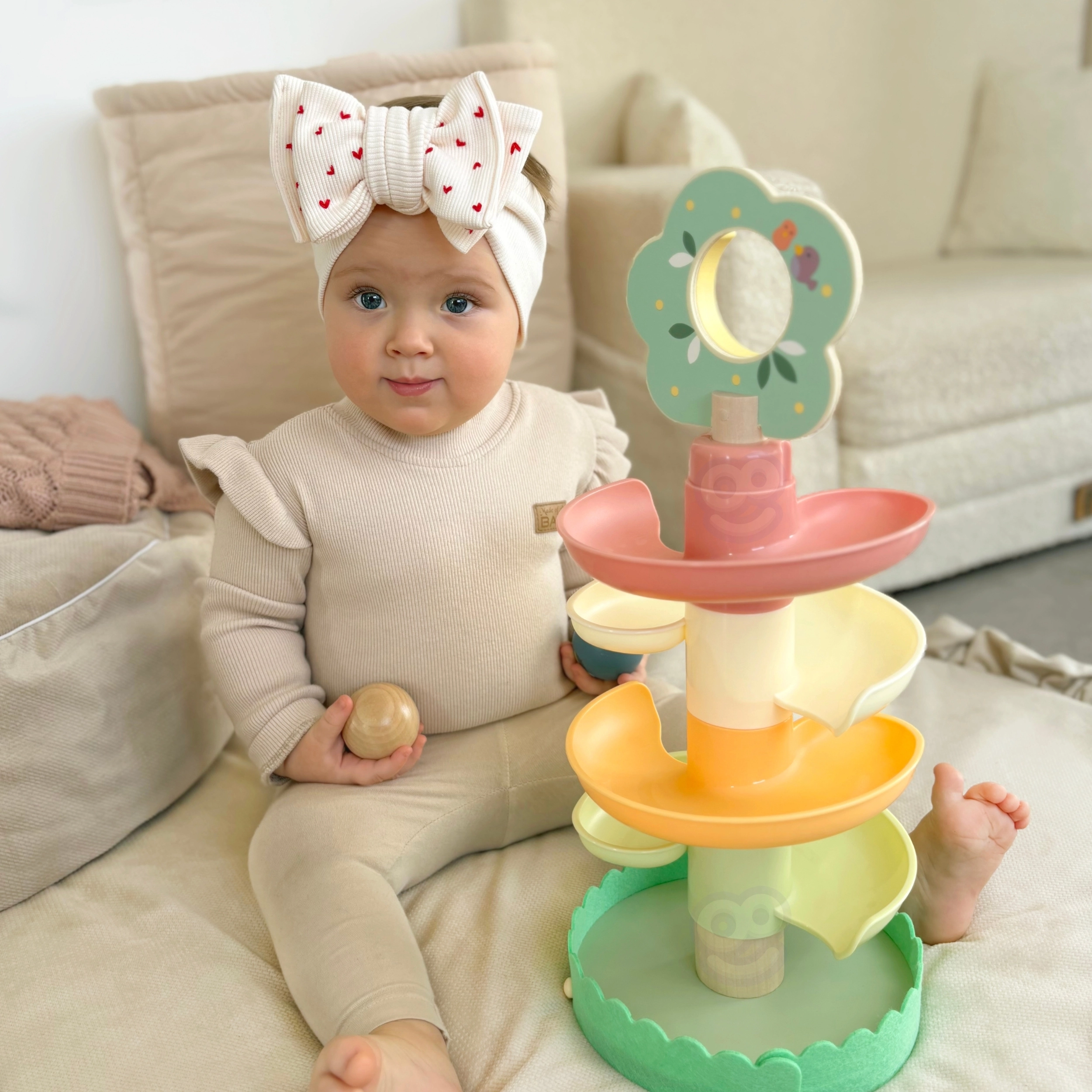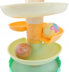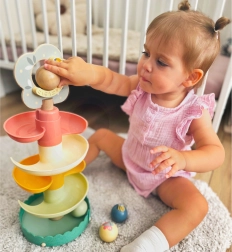 Datorită celor 6 piese ușor de îmbinat, copilul poate construi pista singur, dezvoltând gândirea logică, imaginația spațială și răbdarea. Jocul sprijină de asemenea urmărirea vizuală și motricitatea fină a mâinilor, atunci când copiii prind, introduc și pornesc din nou bilele.