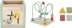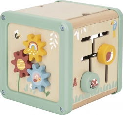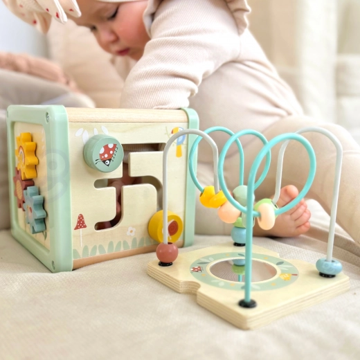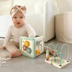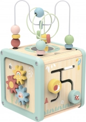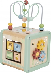 Partea superioară a cubului oferă mărgele colorate de deplasat pe fire curbate, care dezvoltă coordonarea și motricitatea fină. Oglinda stimulează curiozitatea și percepția de sine.