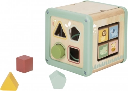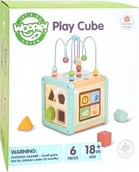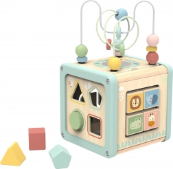 Acest cub din lemn multifuncțional susține dezvoltarea naturală a copilului prin joc semnificativ. Culorile pastel atrag atenția, în timp ce activitățile variate antrenează motricitatea fină, coordonarea mână–ochi, gândirea logică și recunoașterea formelor și culorilor.