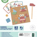 Set complet cu forme din lemn, piuneze, ciocănel și placă de plută. Copiii pot asambla după șabloane sau își pot urma propria imaginație.