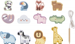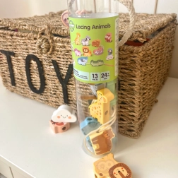 Acest set adorabil conține 11 animăluțe colorate din lemn și un norișor vesel, pe care copiii le pot înșira ușor pe șnurul inclus, cu vârf din lemn. Fiecare piesă are orificii precise pentru înșirat, care cultivă răbdarea și concentrarea. Culorile pastel și designul plăcut stimulează fantezia și transformă învățarea într-o parte naturală a jocului.