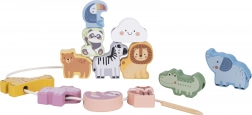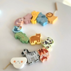 Înșirarea animalelor din lemn pe șnur antrenează în mod natural priza, coordonarea mână–ochi și precizia mișcărilor – o pregătire ideală pentru desen și scris.