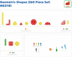 Acest set cuprinzător include pătrate, triunghiuri, cercuri, semicercuri și benzi plate în mai multe culori, care se fixează ușor datorită orificiilor, cu ajutorul șuruburilor, pe panourile, mesele sau cărucioarele Masterkidz. Copiii pot crea modele, flori și construcții mai complexe, exersând planificarea, alegerea elementelor și atenția la detalii.