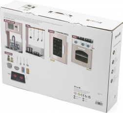 Pachetul include accesorii bogate: oală cu capac, tigaie, lingură, spatulă cu găuri, spatulă, set de „legume” și solniță cu piper. Detalii funcționale precum 3 butoane rotative, uși care se deschid la cuptor și dulap, plus cârlige pentru ustensile, oferă realism jocului și dezvoltă motricitatea fină, creativitatea și abilitățile sociale.