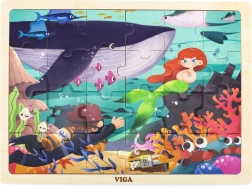 Puzzle-ul pentru copii VIGA – Secretul mării aduce o ilustrație subacvatică colorată cu sirenă, scafandru, pești, recif de corali și navă scufundată. Datorită ramei din lemn, piesele rămân pe poziție în timpul asamblării, iar imaginea de pe placa suport servește drept model clar.