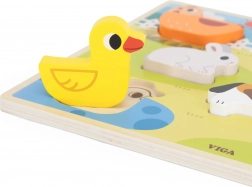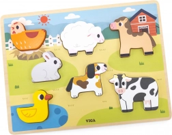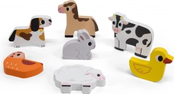 Sunt incluse 7 animăluțe drăgălașe – găinușă, oiță, căluț, iepuraș, rățușcă, cățel și văcuță. Datorită grosimii mai mari a pieselor, manipularea este ușoară, iar copiii le pot folosi și separat ca figurine independente pentru jocuri imaginative.