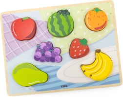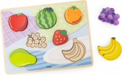 Descoperiți învățarea prin joc cu puzzle-urile din lemn cu fructe de la Viga. Setul include un suport ilustrat color și 7 piese (măr, pepene, portocală, struguri, căpșună, banane și pară), pe care copiii le așază în formele corespunzătoare. Culorile vii și contururile clare susțin recunoașterea formelor și culorilor.
