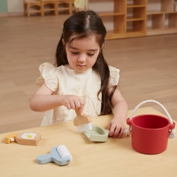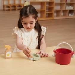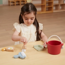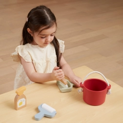 În pachet găsiți o găleată, o periuță cu spatulă, un pulverizator din lemn și o rolă – tot ce are nevoie copilul pentru „marea curățenie”. Susține imaginația și jocul de rol.