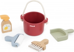 - Echipare completă pentru joc de curățenie: mătură/periuță cu spatulă (lopățică), pulverizator din lemn, rolă pentru scame și găleată roșie.