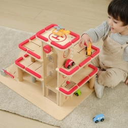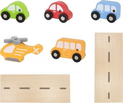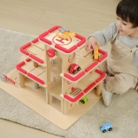 Pachetul include 4 mașinuțe din lemn, un elicopter și elemente de intrare și ieșire. Marcajele clare ale locurilor de parcare, spălătoria și barierele susțin scenarii realiste și îi învață pe copii abilități de coordonare.
