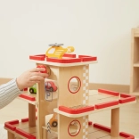 Copiii pot ridica ușor mașinuțele între etaje cu ajutorul liftului mecanic – sprijină coordonarea și motricitatea fină.
