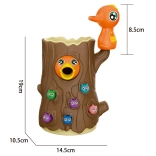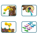 Ciocănitoarea cu cioc magnetic prinde viermișorii ascunși în orificii – copiii își exersează motricitatea fină și coordonarea mișcărilor.