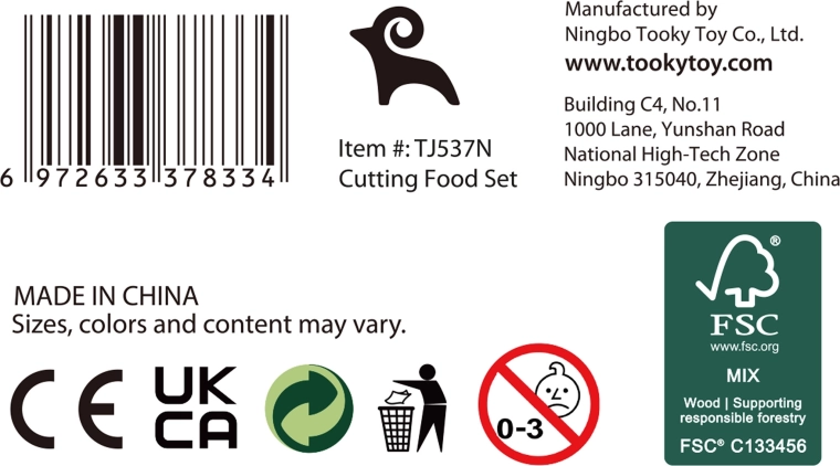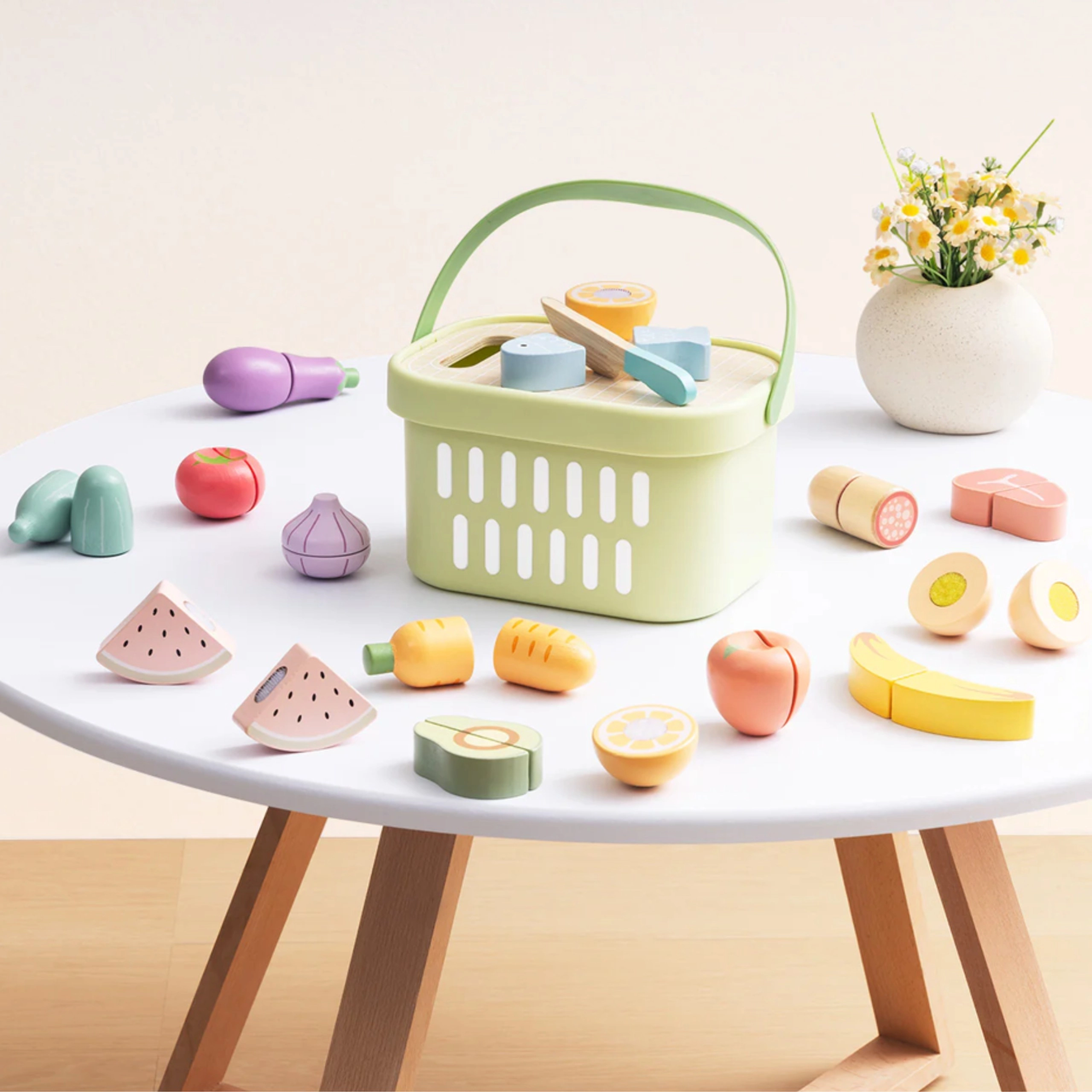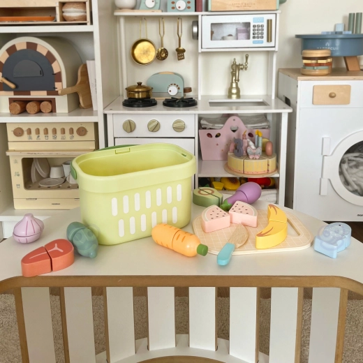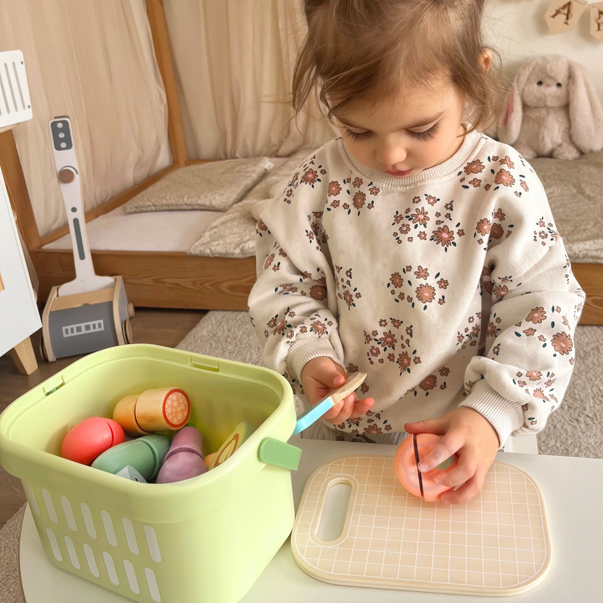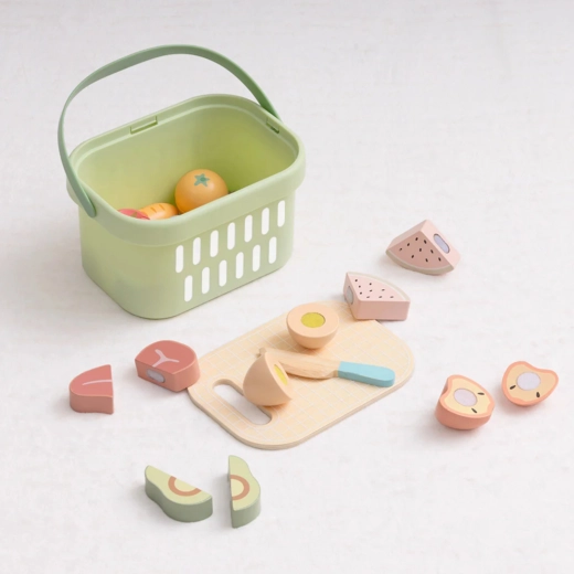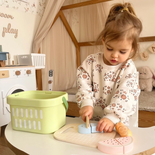 Setul alimentar din lemn TOOKY TOY este ideal pentru o mică bucătărie de jucărie. Fructele și legumele pastelate, peștele, friptura, brânza sau oul sunt împărțite în părți și conectate cu arici – copiii le pot „tăia” în siguranță cu cuțitul de lemn pe tocătorul inclus și le pot reasambla. Totul se depozitează în coșul ușor, astfel încât setul este ușor de transportat și mereu ordonat.