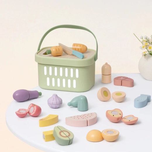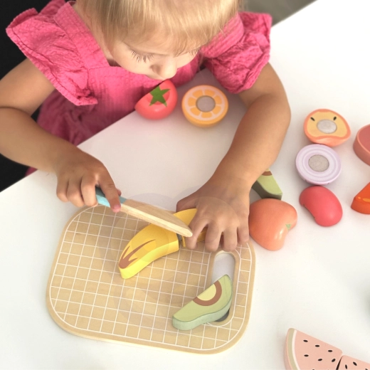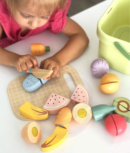 Piesele de fructe și legume sunt segmentate și unite cu arici. Copiii le pot „tăia” în mod repetat cu cuțitul de lemn pe tocător și le pot reasambla.