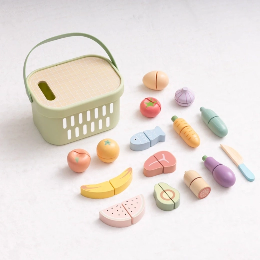 - 31 de piese – fructe, legume, pește, friptură, brânză, ou, tocător, cuțit și coș