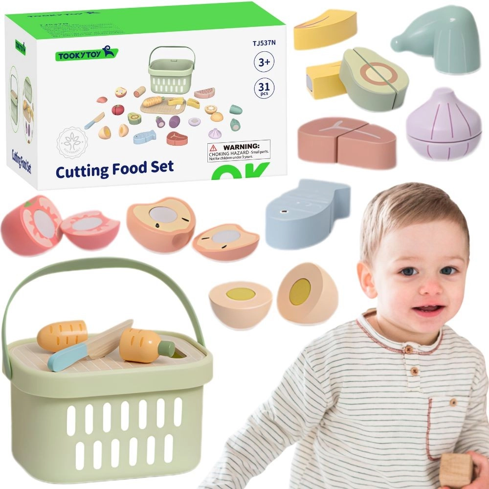 Oferă-le copiilor gătit distractiv cu setul alimentar din lemn TOOKY TOY. Conține 31 de piese, inclusiv fructe, legume, pește, ouă, tocător și cuțit, precum și un coș practic pentru depozitare. Piesele se unesc cu ajutorul ariciului (velcro) sau al magnetului și pot fi „tăiate” iar și iar. Susține motricitatea fină, creativitatea și jocul de rol și îi învață pe copii despre alimentatia sănătoasă.