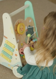 Xilofon, rotițe dințate, mărgele glisante și sortarea formelor captează atenția și dezvoltă motricitatea, logica și percepția senzorială.