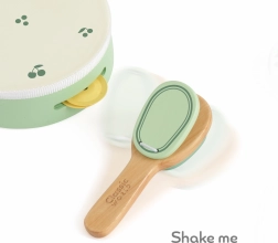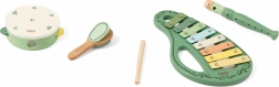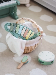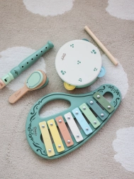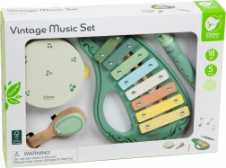 Acest set stilat în variantă vintage conține tot ce au nevoie cei mici pentru a descoperi lumea sunetelor: cimbal (xilofon), tamburină, flaut/recorder, castanietă și baghetă. Datorită combinației de lemn și metal, instrumentele au un sunet plăcut și rezistă la utilizarea zilnică.