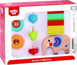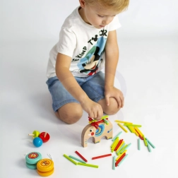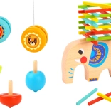 Acest set din lemn cu 46 de piese combină mai multe jocuri îndrăgite într-un singur pachet. Copiii pot echilibra bețișoare pe spatele elefantului, pot construi un turn sau o fântână, pot juca mikado, pot exersa trucuri cu perechea de yo-yo-uri și pot vedea al cui titirez se învârte mai mult. Ideal pentru joacă individuală sau competiții în familie.