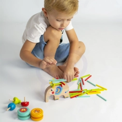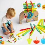 Elefantul din lemn masiv servește ca o bază amuzantă pentru echilibrare și construcție. Copiii își antrenează răbdarea, echilibrul și precizia atunci când așază bețișoarele colorate.
