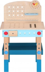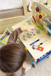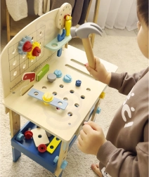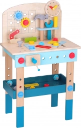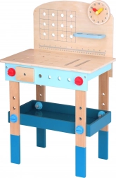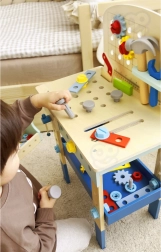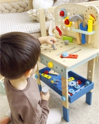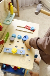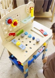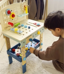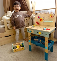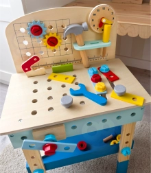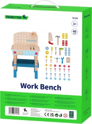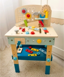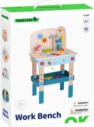 Bancul de lucru din lemn de la Tooky Toy este împlinirea visului oricărui mic meșter. Acest set include o măsuță împreună cu diverse unelte de jucărie: fierăstrău, ciocan, cheie, șurubelniță, menghină, instrument de măsură, șuruburi, piulițe, șaibe și roți dințate. Datorită rafturilor și suporturilor mesei, copiii vor avea totul la îndemână, iar componentele setului pot fi fixate de măsuță. Jucăria este proiectată în siguranță pentru copii, colțurile și marginile sunt rotunjite pentru a preveni rănirile.
