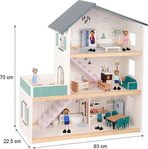 Căsuța de păpuși din lemn de calitate aduce un design modern, deschis, cu 3 etaje pentru acces ușor la joacă. La parter găsești bucătărie cu zonă de luat masa și o baie complet echipată, la primul etaj un living primitor cu șemineu și TV, iar în mansardă un dormitor cu pat, șifonier și un colțișor cu leagăn pentru bebeluș. Nu lipsește nici balconul pentru scenarii în aer liber.