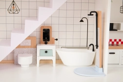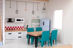 Descoperiți farmecul arhitecturii moderne în lumea copiilor. Căsuța din lemn pentru păpuși TOOKY TOY are 3 niveluri pline de detalii – bucătărie cu sufragerie și baie la parter, living spațios la primul etaj și un dormitor confortabil cu balcon la mansardă. Setul include mobilier și decorațiuni care oferă fiecărei camere o atmosferă realistă.
