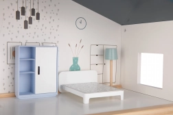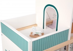 Căsuța este realizată din lemn durabil certificat FSC și vopsită cu vopsele netoxice în nuanțe pastelate delicate.
