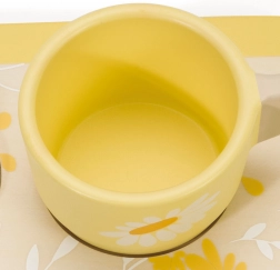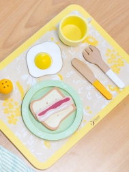 Setul conține farfurie, tacâmuri, cană, sare, piper, ou, felii de pâine prăjită, o felie de bacon și altele.